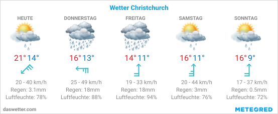 Unsere erste Station wird Christchurch sein. Auch, wenn wir von dort aus Richtung alpiner Umgebung unterwegs sein werden, bekommen wir schon einmal einen ersten Eindruck vom Wetter bei der Ankunft: