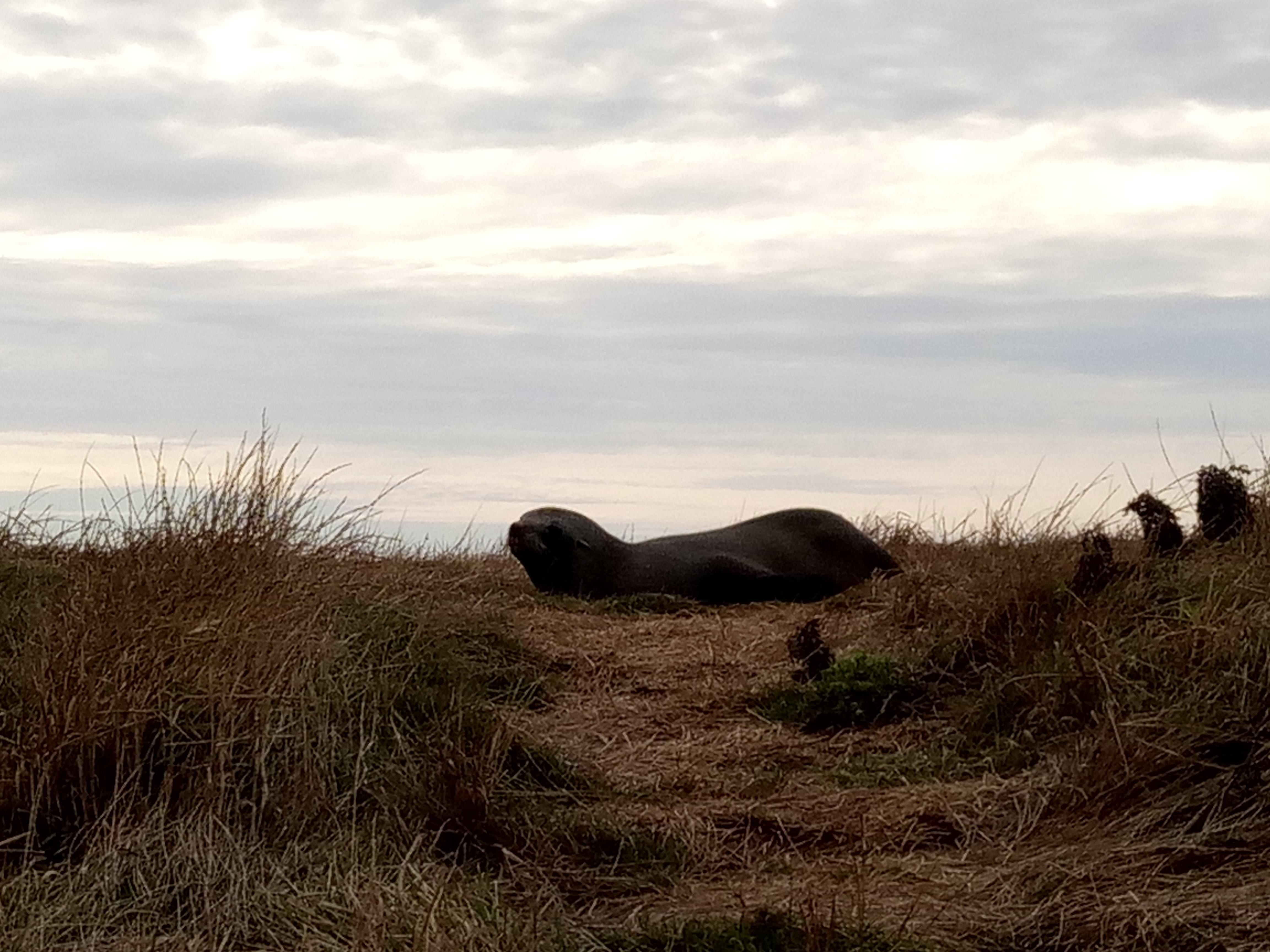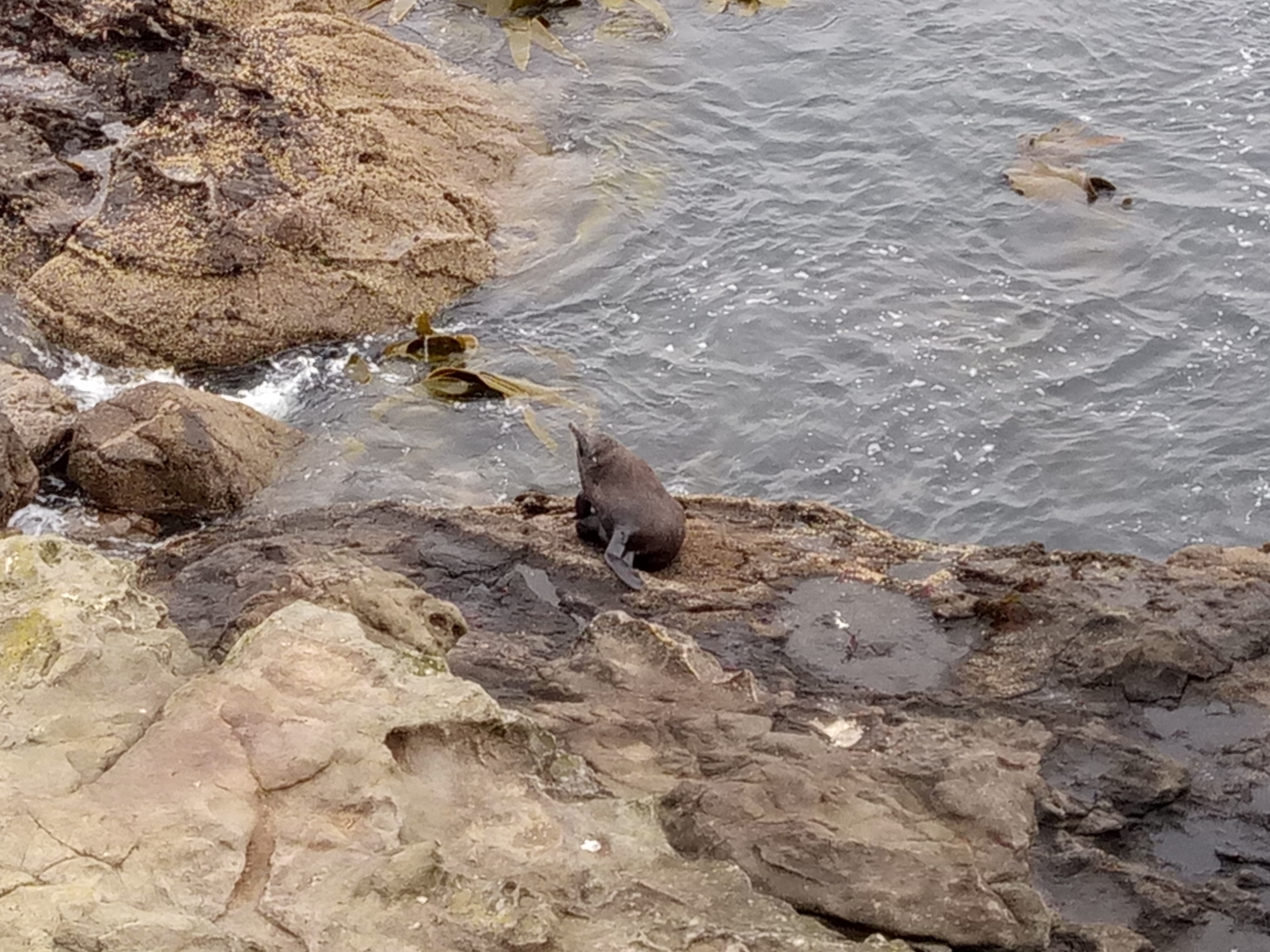 Dummerweise kommen die Pinguine normalerweise nur in der Dämmerung an Land und verbringen die Nacht in ihren Nestern. Einen hat Martina vor die Linse bekommen, aber er war für Handyfotografie zu weit weg.