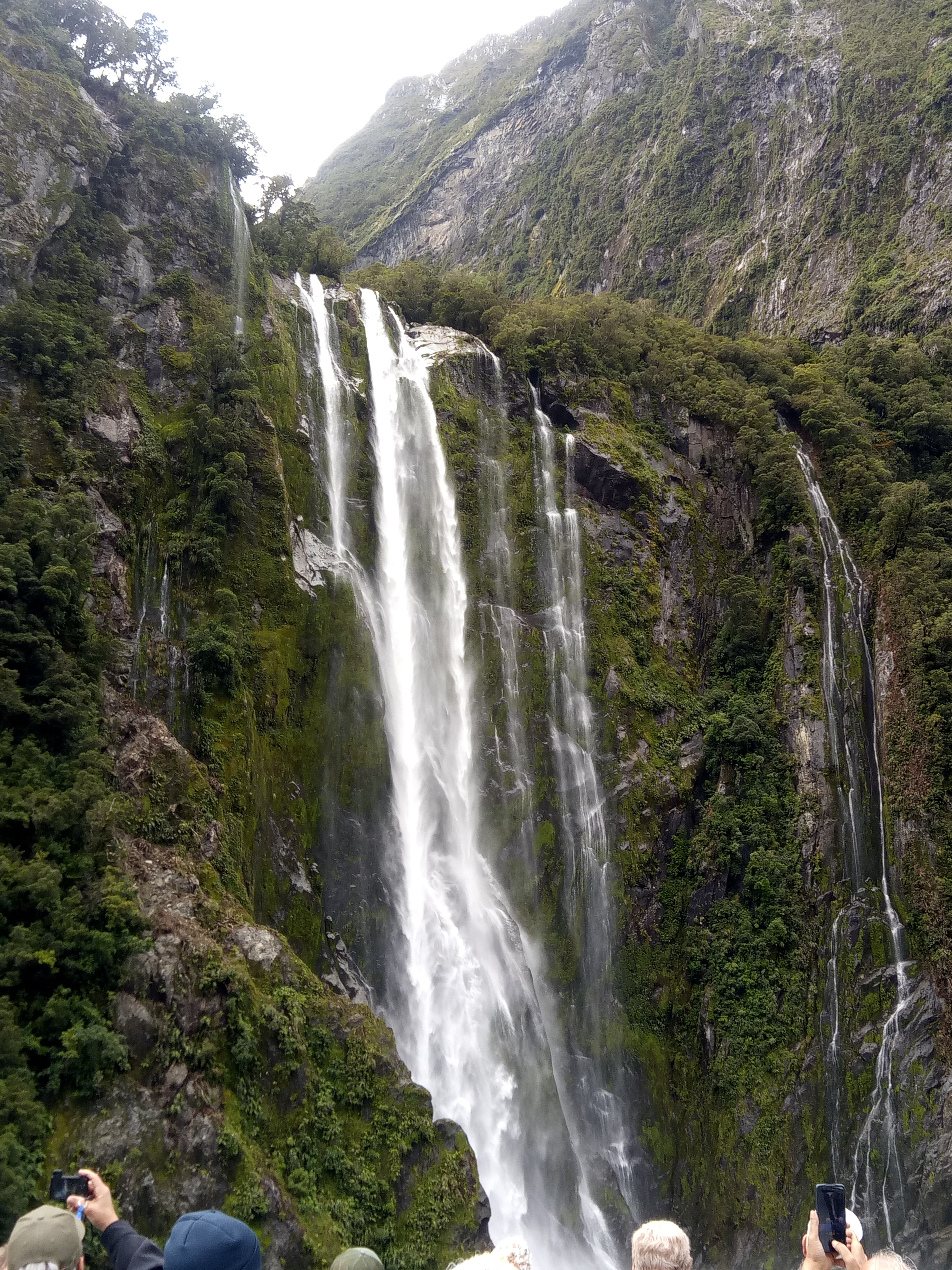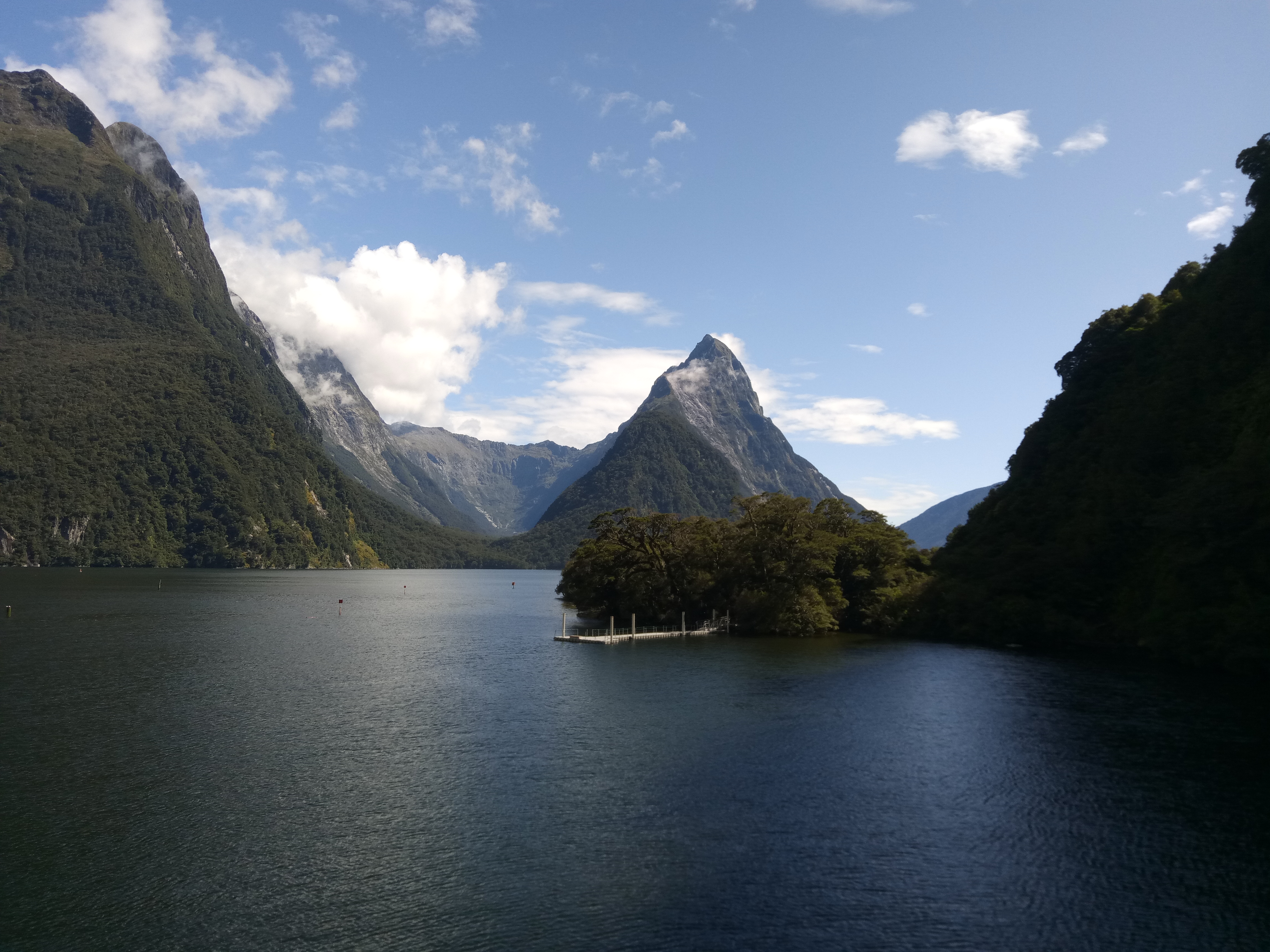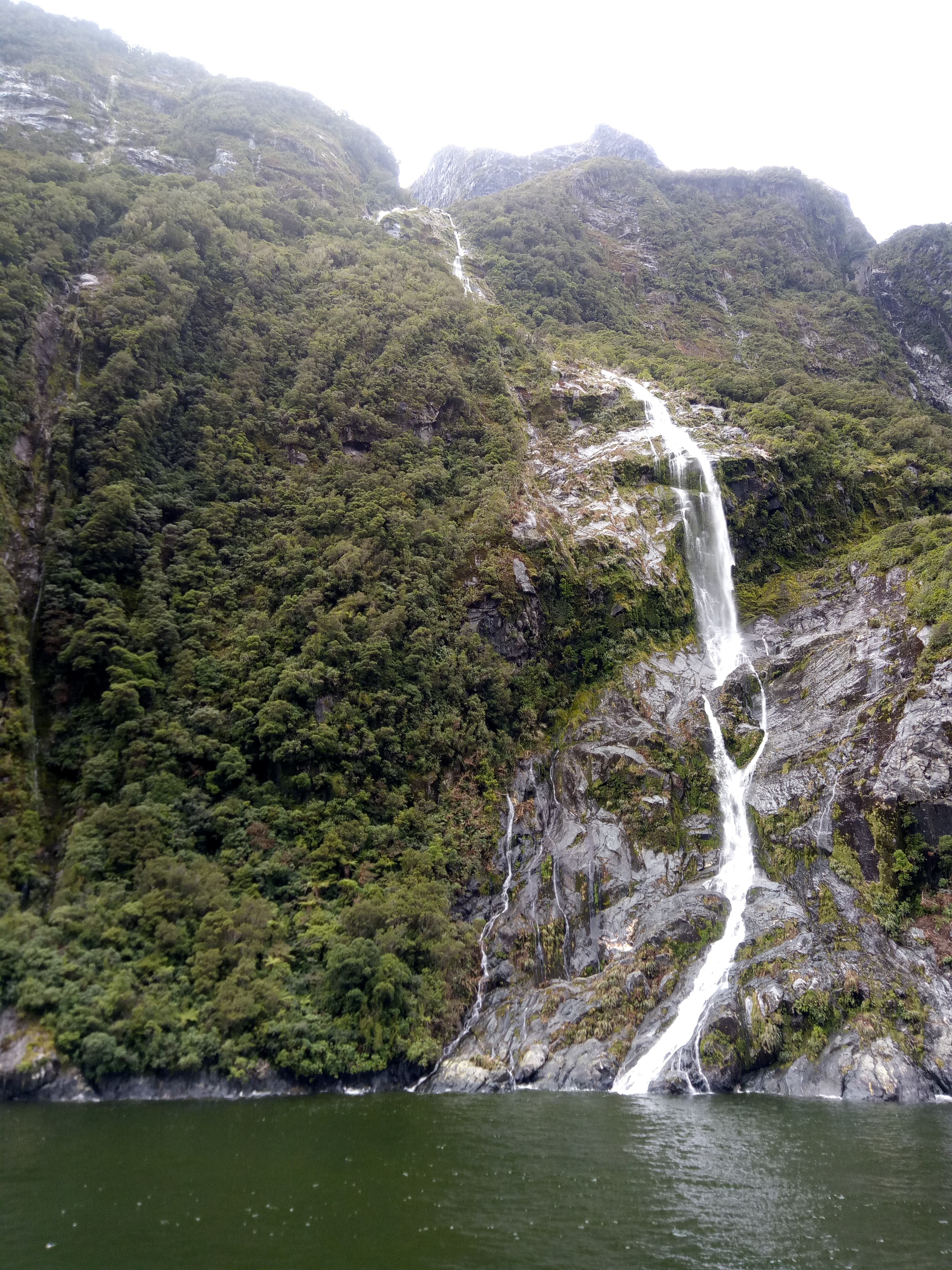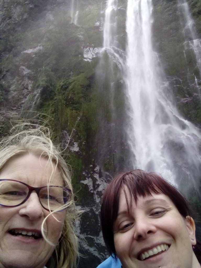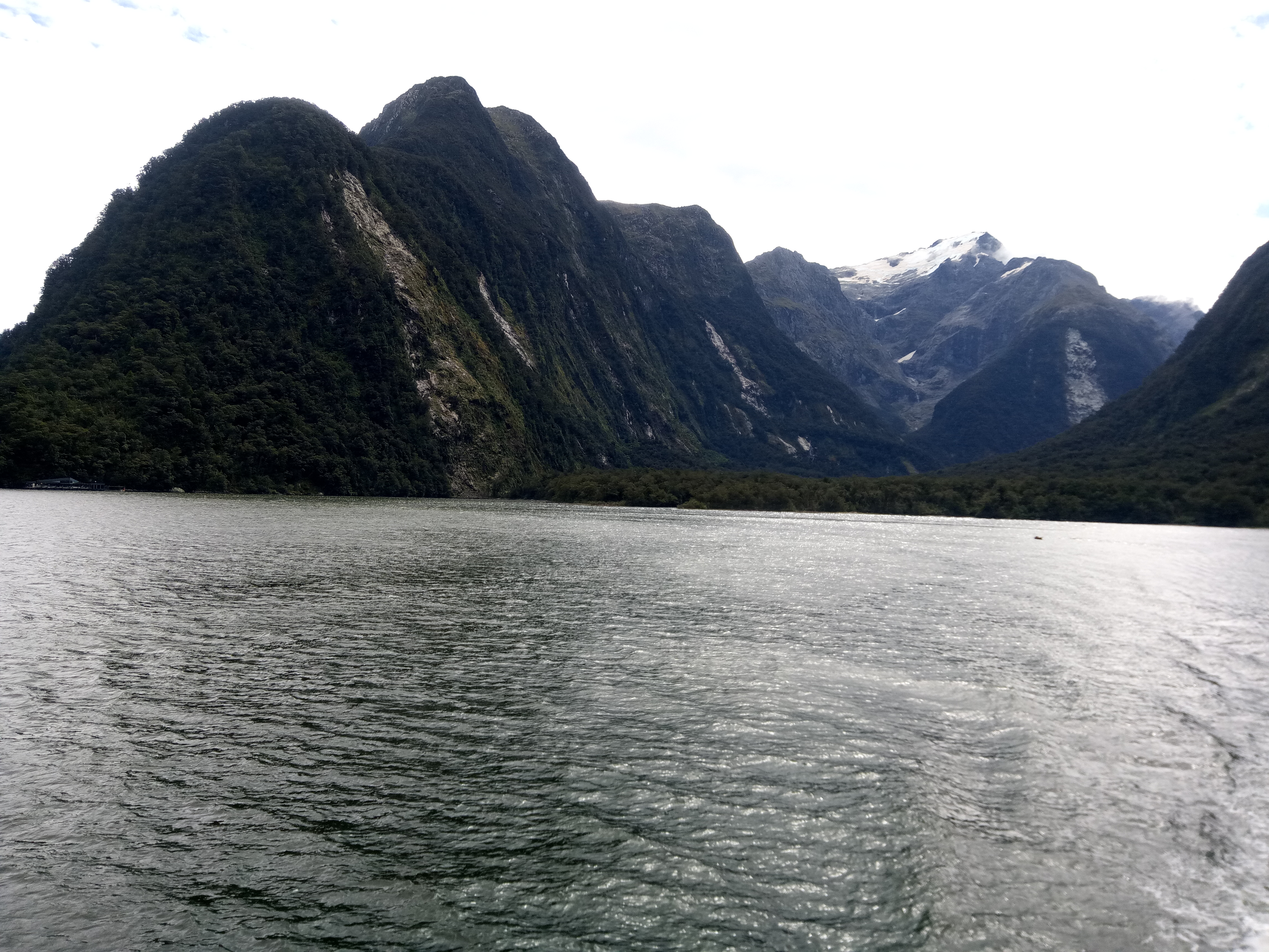 Der Sound (der eigentlich ein Fjord ist, aber wegen dem Marketing will es niemand umbenennen) hat etwa 220 Regentage im Jahr. Während es aber in Te Anau, unserem Ausgangsort, nieselte, hatten wir auf dem Wasser sogar Sonne. Wenn Engel reisen, oder wie war das? Jedenfalls dauert es 3h im Bus-Konvoi hin, 2h Rundfahrt und 3h zurück. Aber wenigstens Mal nicht selbst am Steuer.